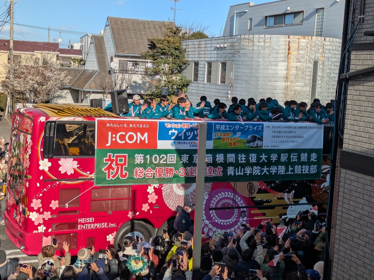 原晋監督と箱根路を駆け抜けた選手たちはオープンバスに乗り、沿道に集まったファンへ笑顔で手を振りながら進みました。