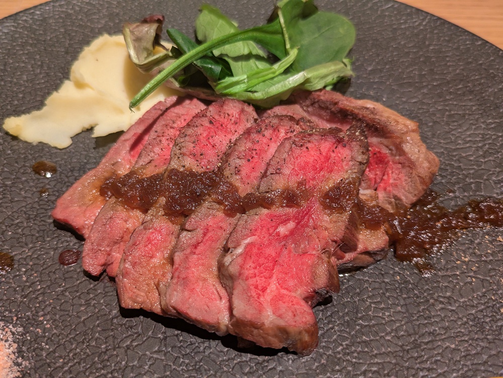 低温で丁寧に火入れされた赤身肉のステーキ。
