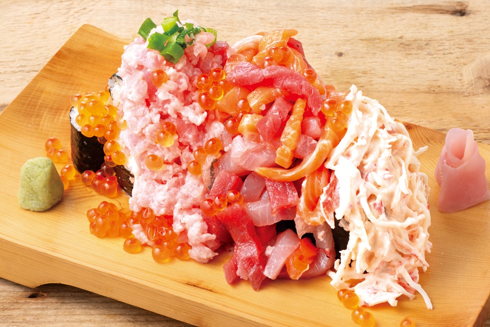 特に人気の「ぶっかけ寿司こぼれ盛り」は、細巻2本の上にマグロ・ブリ・サーモン・ネギトロ・カニマヨ・イクラがたっぷり乗った贅沢な一皿。迫力と満足度の高さでリピーターも多い人気メニューです。