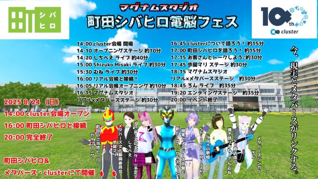 このイベントは、町田シバヒロの開園10周年と、メタバースプラットフォーム「cluster(クラスター)」のサービス開始10周年を記念した特別コラボレーションです。町田市観光コンベンション協会とクラスター株式会社がタッグを組み、リアルとバーチャルを繋ぐハイブリッドイベントを企画しました。
