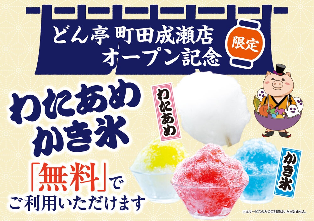 グランドオープンを記念し、メイン料理を注文したお客様を対象に「わたあめ」「かき氷」の無料サービスを実施しています。