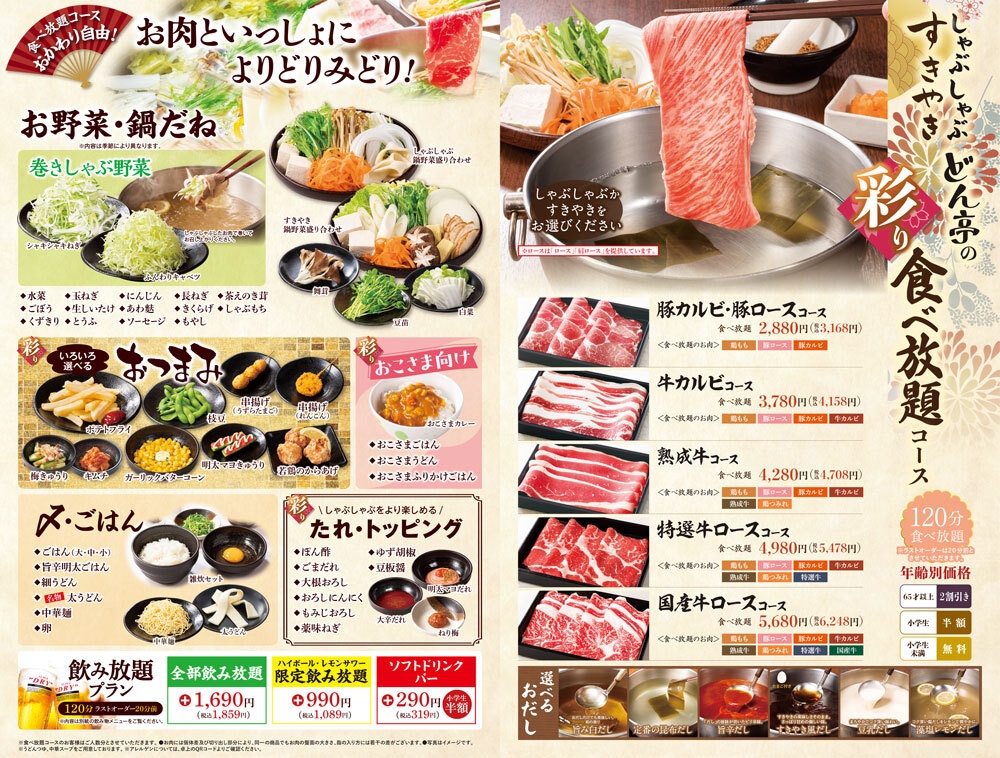 「しゃぶしゃぶどん亭」は、本格的なしゃぶしゃぶ・すき焼きを中心に、食べ放題や定食など幅広いスタイルで楽しめるしゃぶしゃぶレストランです。
