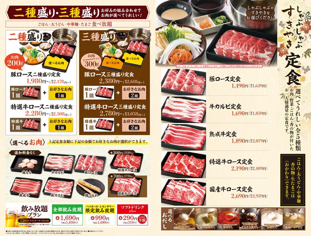町田成瀬店では、しゃぶしゃぶ・すき焼きの食べ放題メニューをはじめ、定食やランチなど豊富なメニューが用意されています。