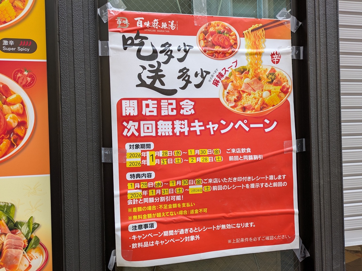 百味麻辣湯の開店記念キャンペーンは、「まず1回食べて、次はお得にもう1回」という流れを作れる絶好の機会。