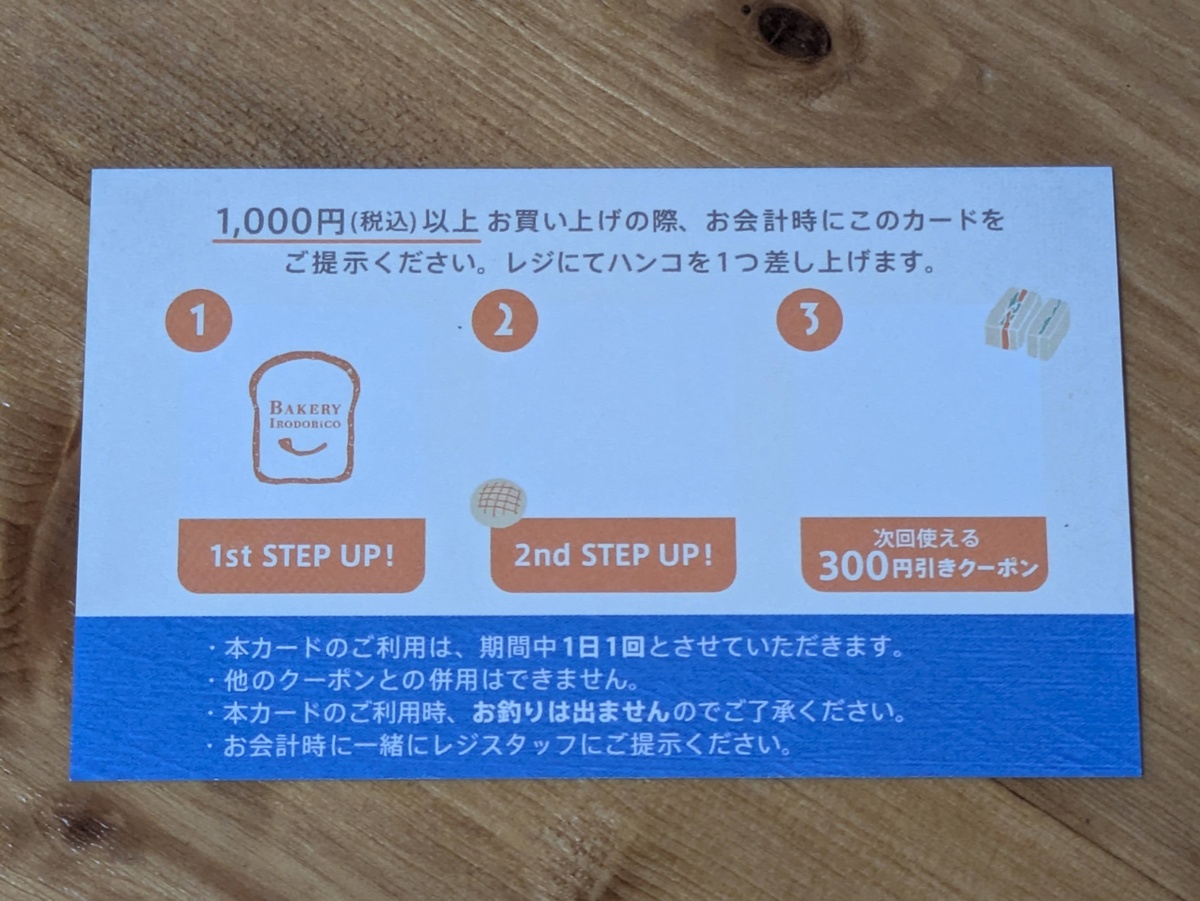 1000円以上の購入でスタンプが1つもらえ、3つ集めると300円引きになる特典付きです。