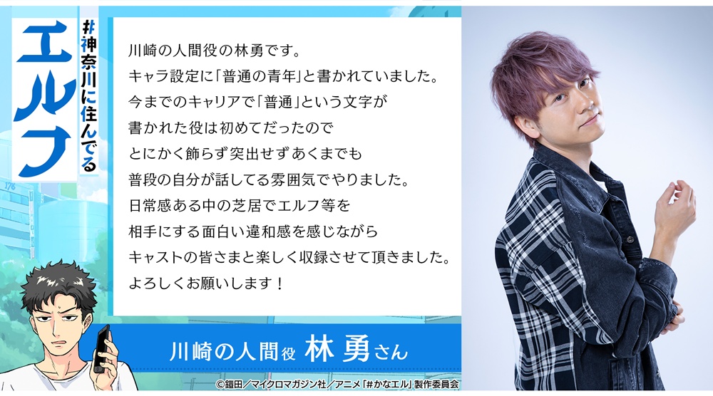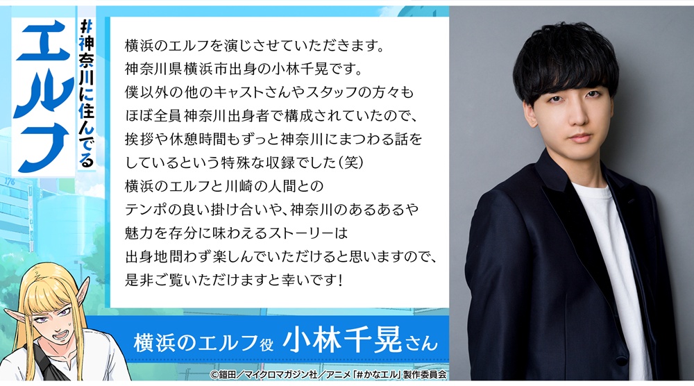 神奈川県を舞台にした新作TVアニメ『#神奈川に住んでるエルフ』の最新情報が解禁されました!キャスト第1弾として、横浜のエルフ役は小林千晃さん(横浜市出身)、川崎の人間役は林勇さん(座間市出身)に決定。さらに描き下ろしキービジュアルやティザー映像、公式サイトも公開されています。