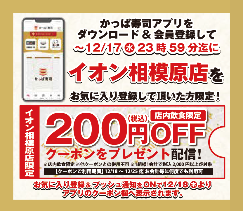 12月17日(水)23:59までに「かっぱ寿司 イオン相模原店」をお気に入り登録した方限定で、12月18日(木)~12月25日(木)の期間中、店内飲食で使える“200円OFFクーポン”を何度でも利用可能!