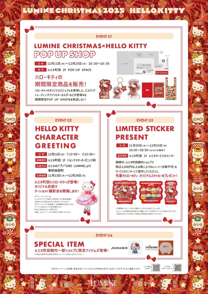 ハローキティをはじめ、仲間たちも登場する楽しいクリスマスイベントが盛りだくさん。館内限定ビジュアルやPOP UP SHOP、特典プレゼントなど、この季節だけの特別な体験を楽しめます。ぜひルミネ町田でクリスマス気分を満喫してください!