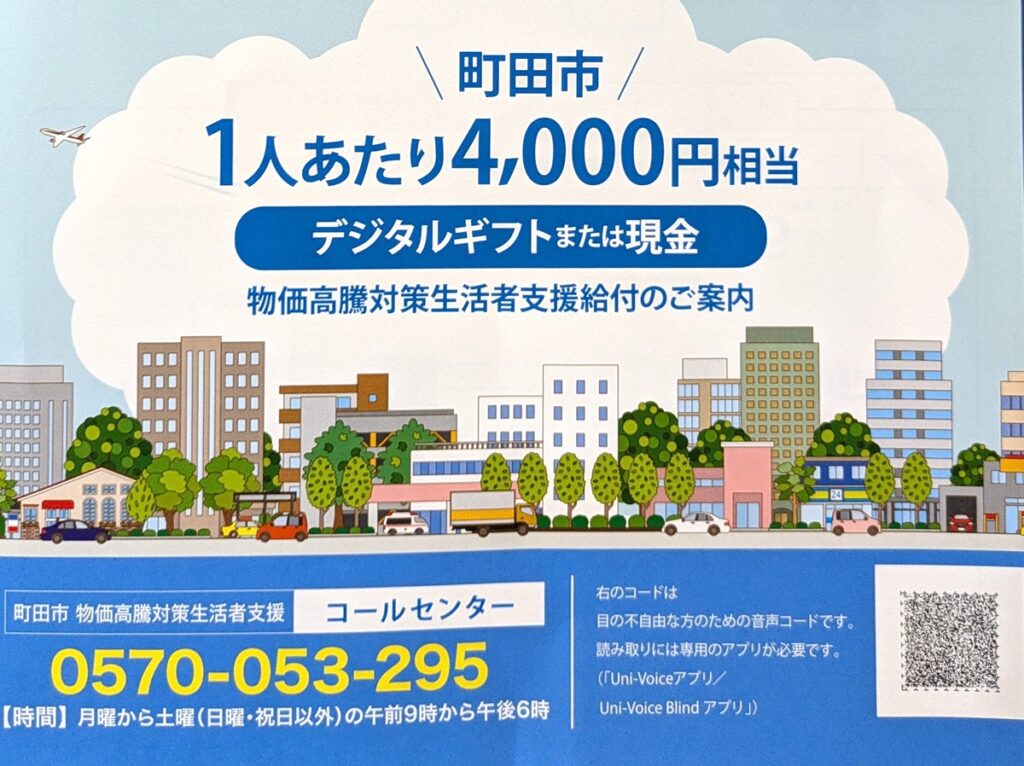 町田市では、市民全員を対象に1人あたり4,000円相当を給付する物価高騰対策生活者支援給付を実施しています。