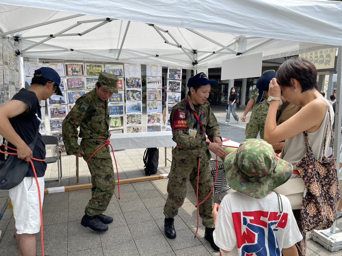 自衛隊・町田消防署のプロが災害対応を紹介。軽装甲機動車展示、迷彩服試着、応急担架作成、消防車展示、起震車体験など、子どもから大人まで楽しめる体験型プログラムです。
