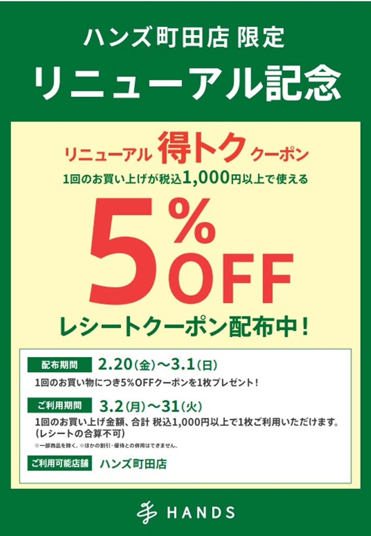 リニューアル記念として、町田店限定の5%OFFクーポンを配布。