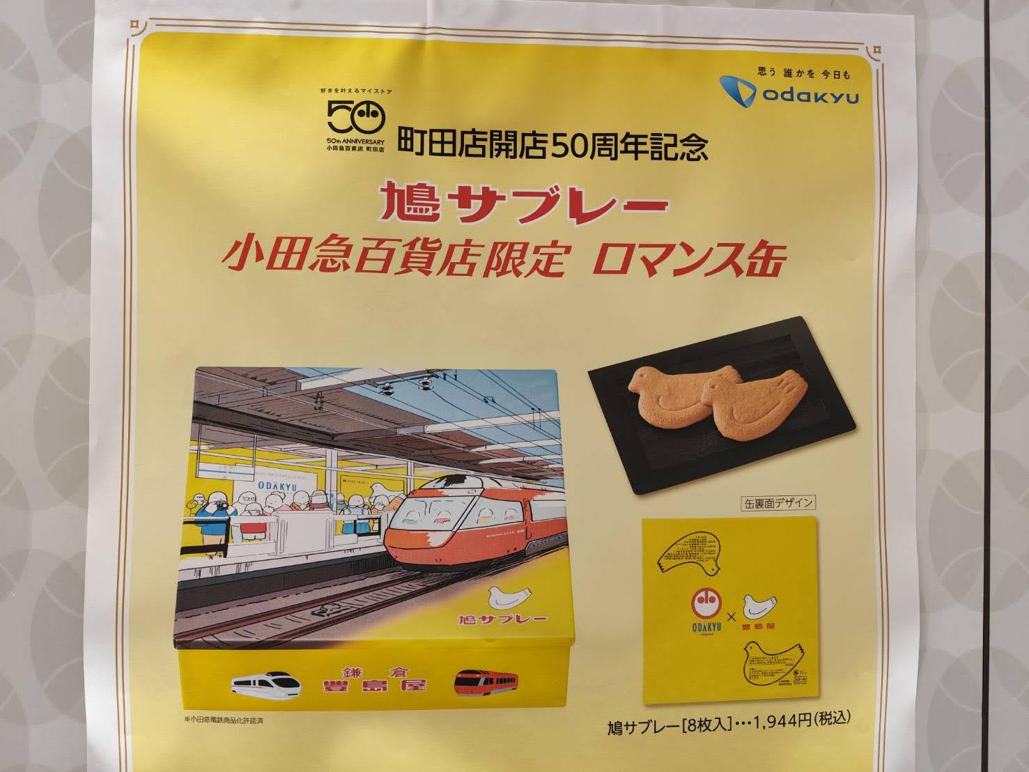 今回の「ロマンス缶」は、鎌倉の老舗・豊島屋の鳩サブレーと、小田急電鉄の特急ロマンスカーがコラボした限定デザイン。