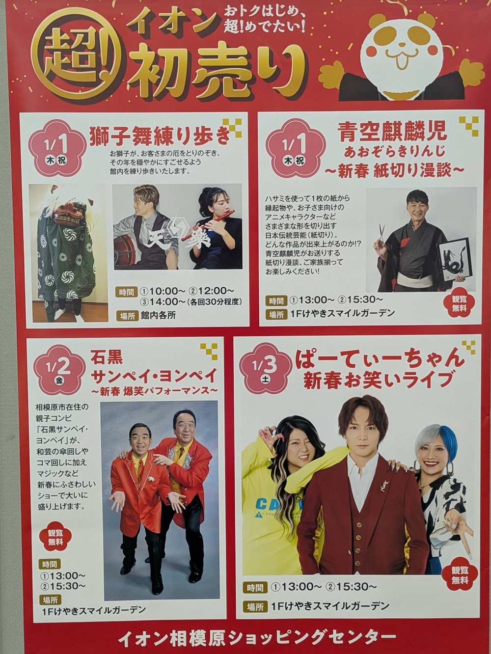 お正月のイオン相模原で開催される「ぱーてぃーちゃん 新春お笑いライブ」。