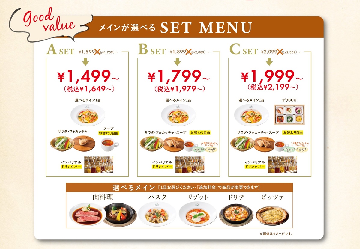 今回のキャンペーンでは、以下のセットがディナーでもランチ価格で利用可能になります。