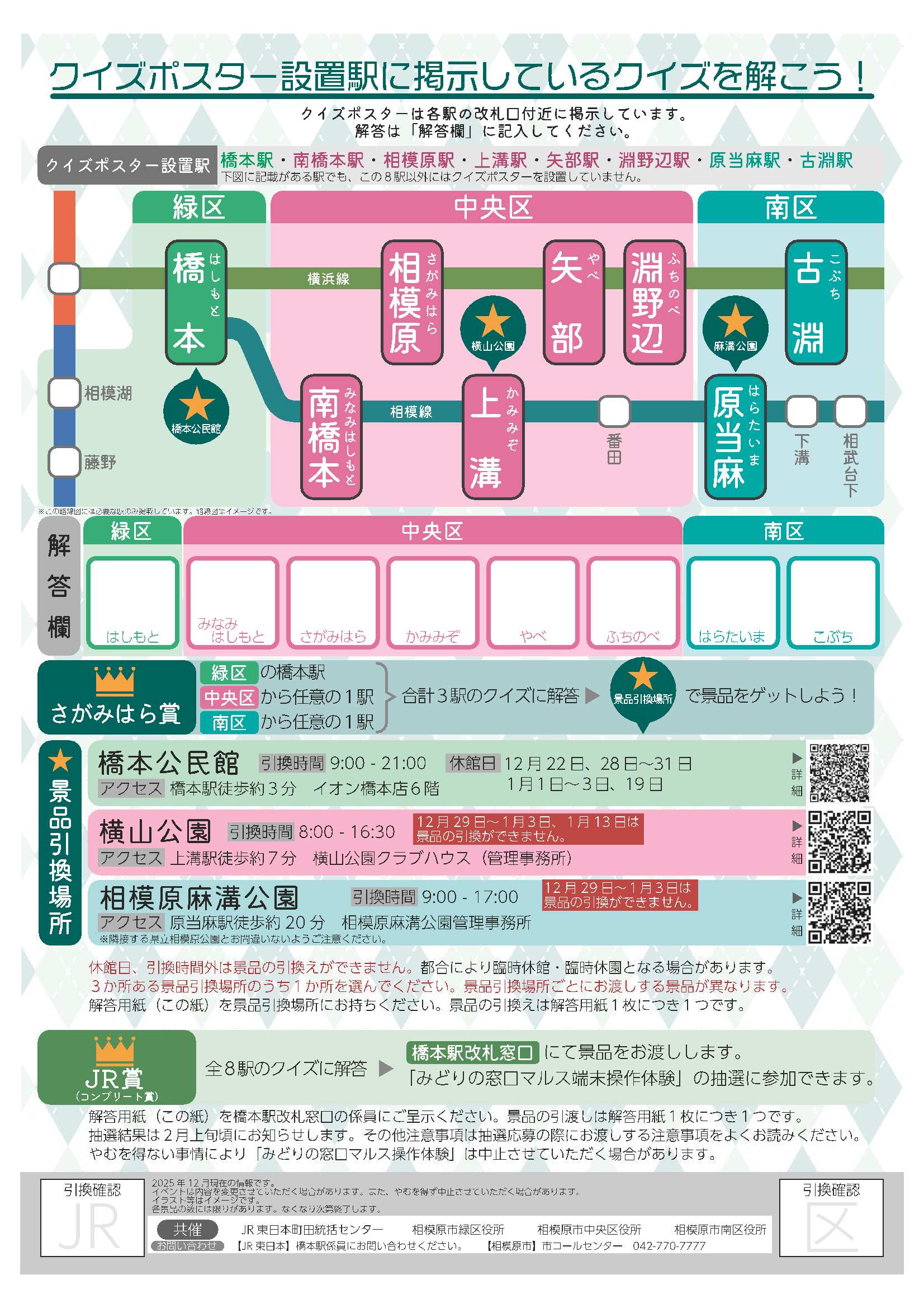 緑区・中央区・南区それぞれのクイズ設置駅から1駅ずつ、合計3駅分のクイズに回答することで、景品の引換が可能です。