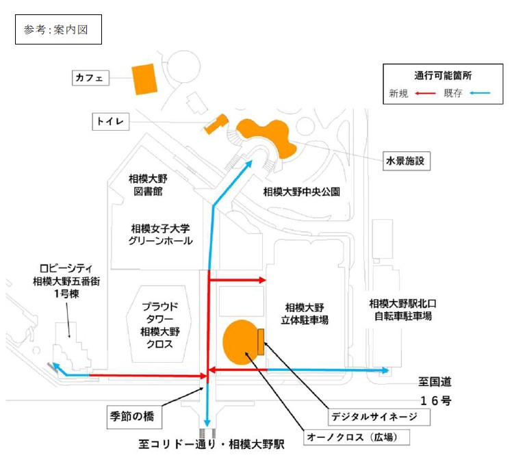 この新しい歩行者専用通路は、相模大野駅からコリドー通りを進み、その先で新設された通路へ入る動線となっており、季節の橋を渡ることで、