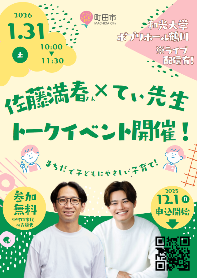 【町田市】「佐藤満春さん×てぃ先生 トークイベント~まちだで子どもにやさしい子育て!~」を1月31日(土)開催!