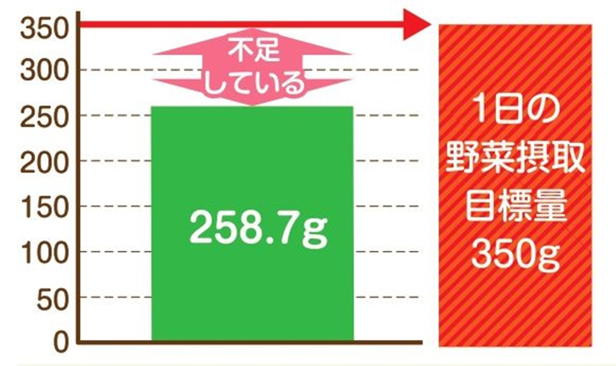 目標とされている野菜摂取量は、1日350g以上。しかし、令和6年国民健康・栄養調査によると、20歳以上の平均野菜摂取量は258.7gと、約100g不足している状況です。