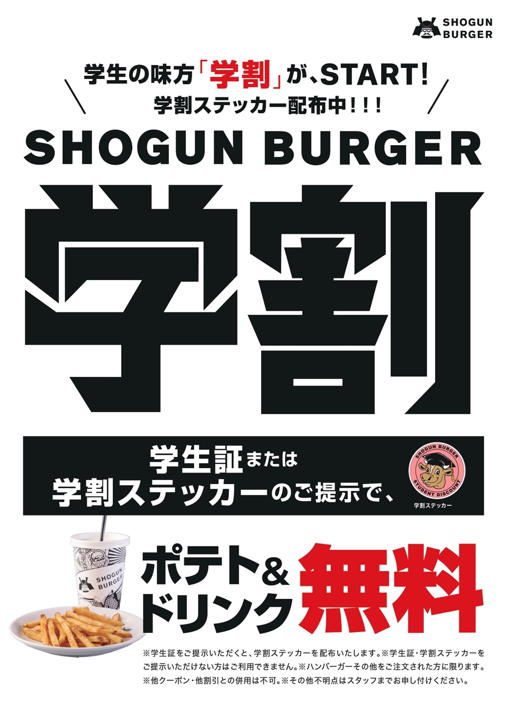 学割シールやポテト&ドリンクSETプレゼントなど学生必見のキャンペーンを実施します。
