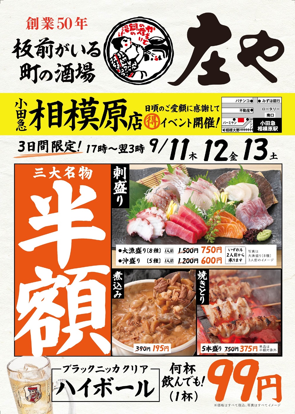 小田急相模原駅近くの「庄や 小田急相模原店」で、2025年9月11日(木)~13日(土)の3日間限定で半額感謝祭が開催されます。刺身盛り、煮込み、焼き鳥といった三大名物が半額で楽しめるほか、ハイボールも驚きの99円!地域の方々に感謝を込めた特別企画です。