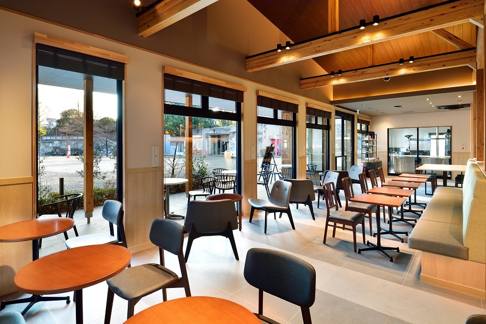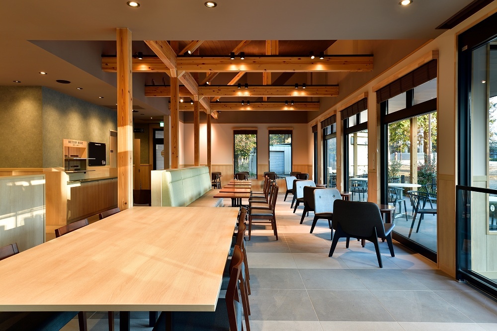 屋根の形状が印象的な外観には国産木材を使用し、相模大野中央公園の自然と調和するデザインを採用。店内は、全方向から木の質感を感じられるつくりで、高さのある天井が開放感を演出しています。